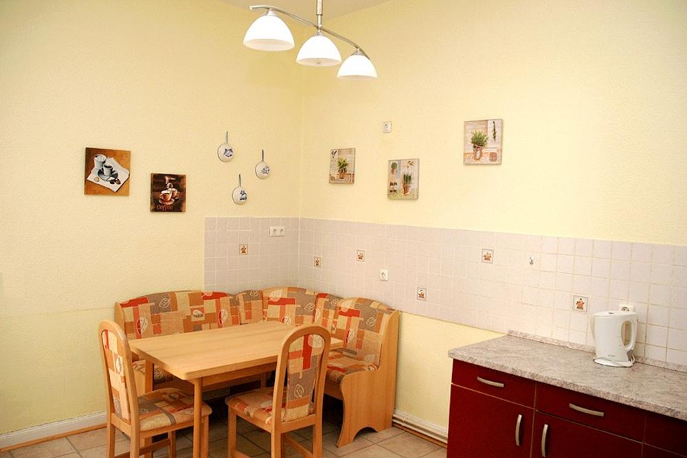 Unsere helle Ferienwohnung besteht aus einer großen Küche mit Tisch und Eckbank, einem Bad und einem geräumigen WC. Die beiden anderen Zimmer sind als Schlafzimmer mit jeweils zwei getrennten Betten ausgelegt. Die Küche ist mit Kochplatten, einer Mikrowelle mit Grill- und Backfunktion und einem Kühlschrank mit Gefrierfach ausgestattet.