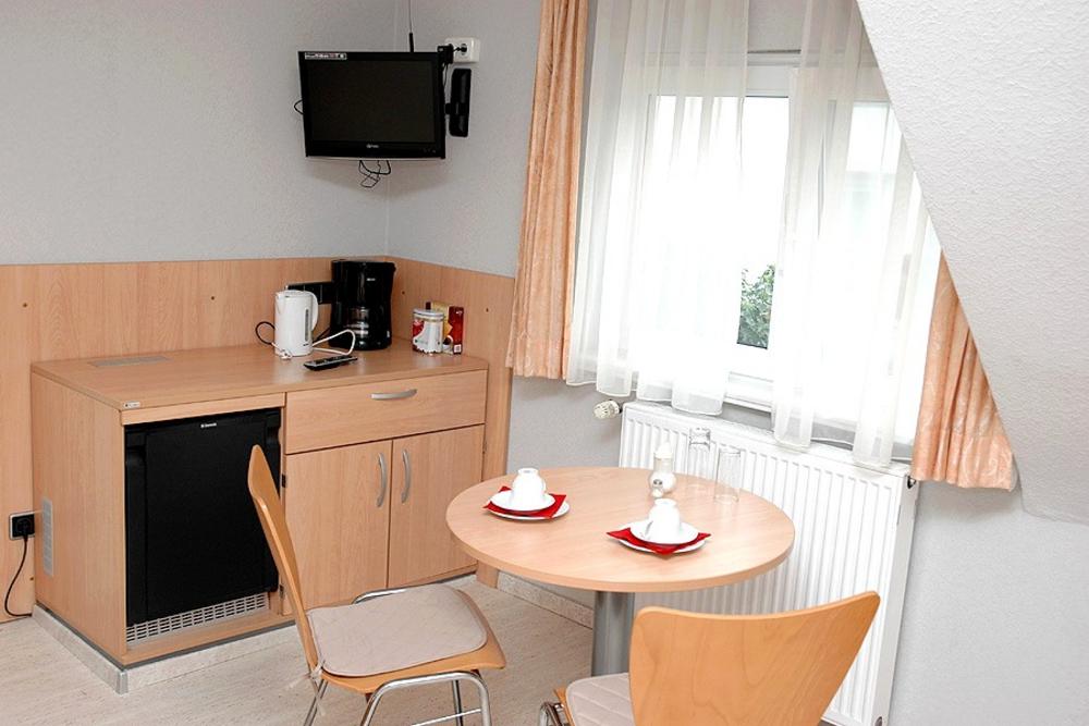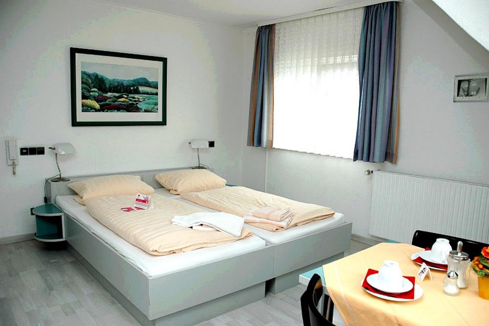Wir bieten Ihnen in allen Zimmern folgende Ausstattung: Dusche/WC, Telefon, TV, Kühlschrank, WLAN, Kaffeemaschine. (Zimmergröße zwischen 15 und 19 m²) Jedes Gästezimmer ist über eine eigene Klingel erreichbar.