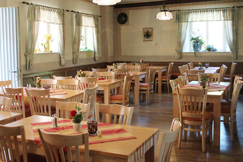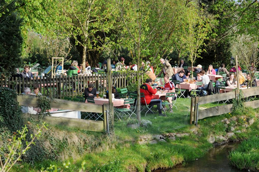 The restaurant serves vegetarian and light dishes. A beer garden by the stream offers a lovely atmosphere.