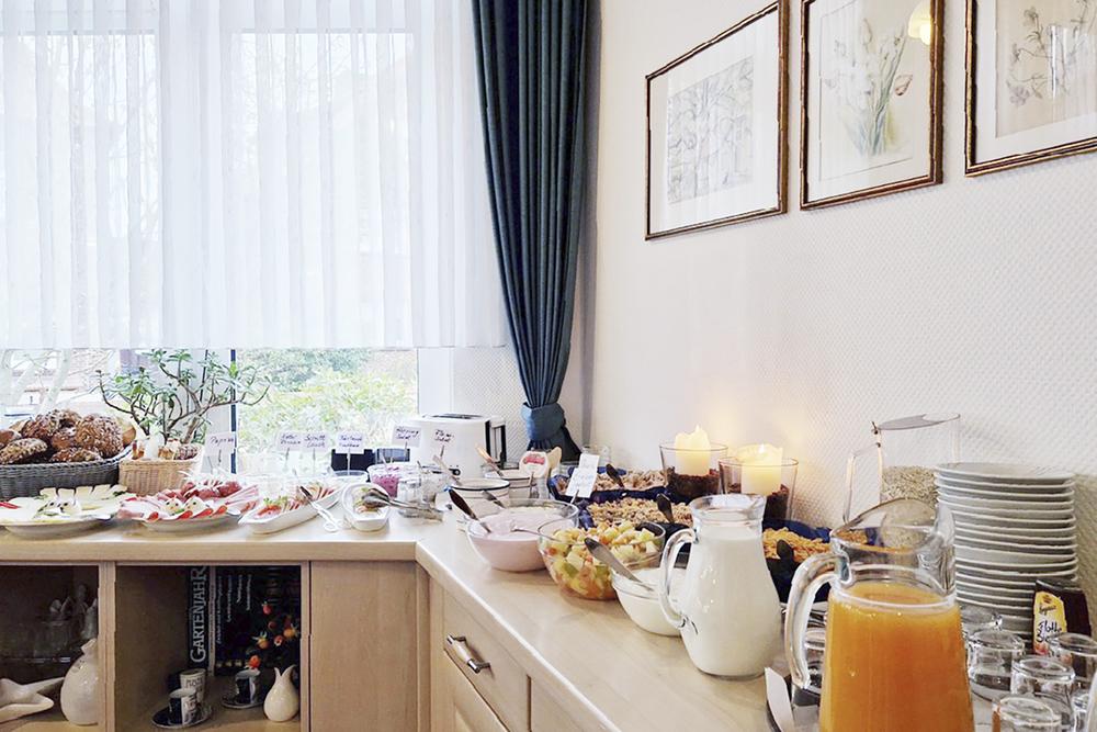 Ein neuer Urlaubstag auf Juist beginnt. Wir hoffen, Sie hatten angenehme Träume! Herrlich, wenn man so gut ausgeschlafen ist und sich direkt an den hübsch eingedeckten Frühstückstisch setzen kann. Es gibt frischen Kaffee und Ostfriesentee und am Büffet knusprige Brötchen, Eier, Wurst und Käse, Marmeladen und Quark, Müsli, Obst und noch vieles mehr.