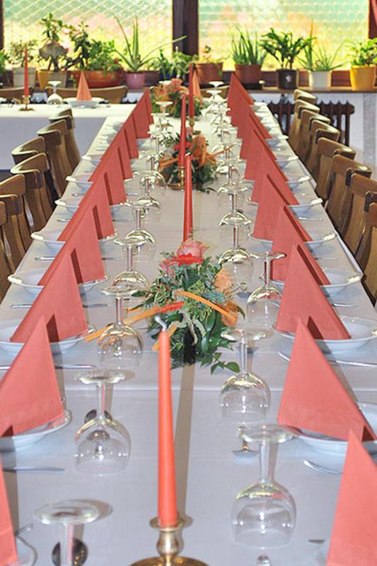 Qu'il s'agisse d'un club ou d'une fête de famille, notre spacieuse salle attenante peut être agrandie de 45 à 90 places, ce qui permet d'accueillir des fêtes plus importantes. Nous nous ferons un plaisir de vous proposer des menus intéressants dans différentes catégories de prix.