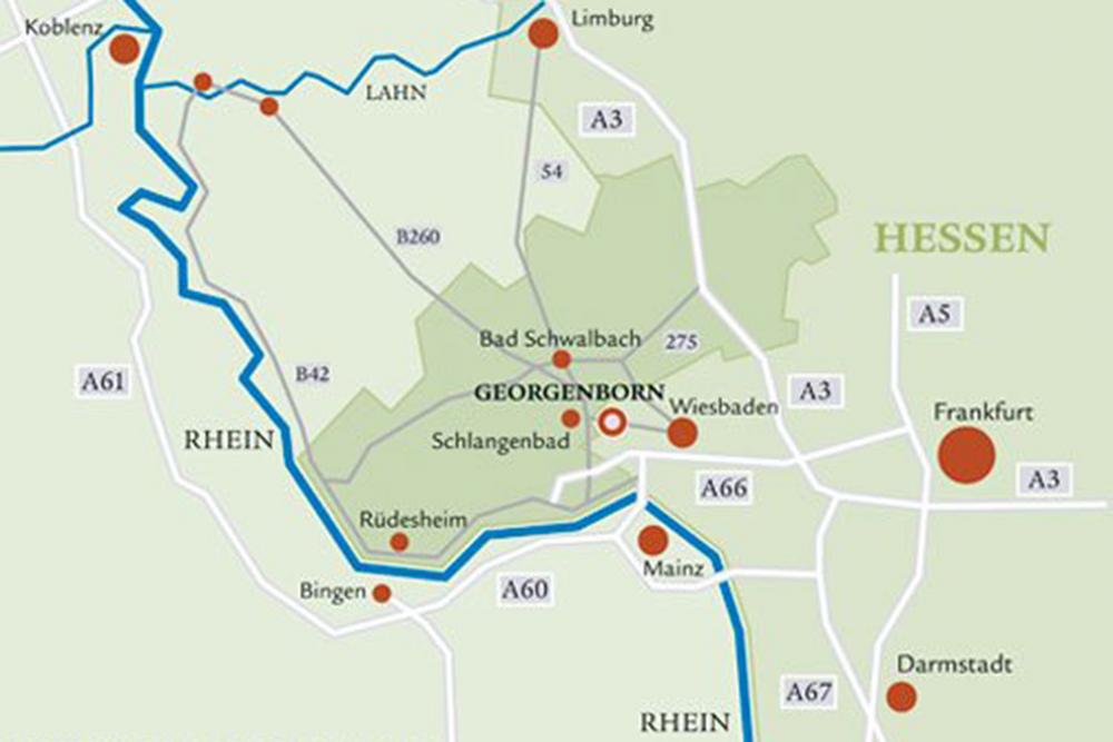 The Rheinsteig, Germany's new premium hiking trail, passes right by Georgenborn. It runs from Wiesbaden to Bonn through magnificent natural scenery, passing the most beautiful views in the Middle Rhine Valley. It can be hiked from here, as can numerous other routes.